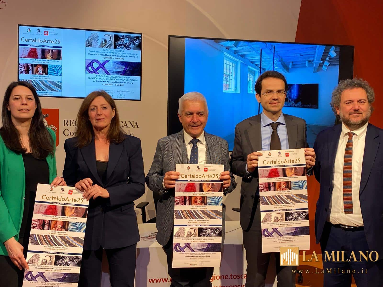La presentazione del programma si è tenuta ieri mattina (giovedì 27 febbraio) nel Media center Sassoli di palazzo del Pegaso. Sono intervenuti i consiglieri regionali Francesco Gazzetti, segretario questore dell’Ufficio di presidenza dell’Assemblea toscana, ed Enrico Sostegni. Con loro Giovanni Campatelli, sindaco di Certaldo, Clara Conforti, assessora comunale alla cultura, e Francesca Parri, curatrice e coordinatrice del progetto per Exponent.
